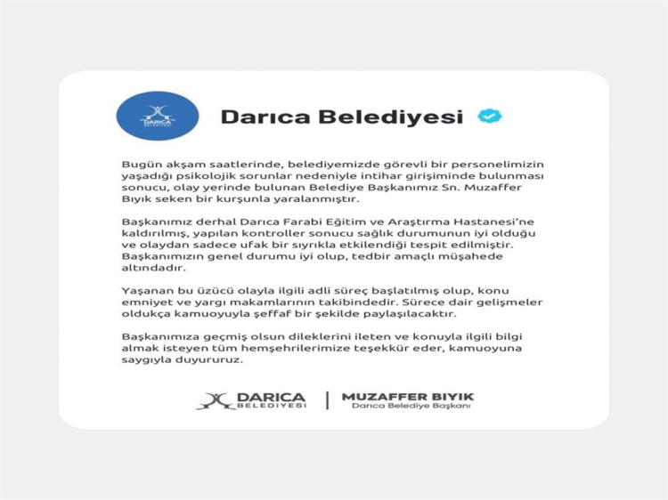 “Belediyemizde görevli bir personelimizin yaşadığı psikolojik sorunlar nedeniyle intihar girişiminde bulunması sonucu, olay yerinde bulunan Belediye Başkanımız Sn. Muzaffer Bıyık seken bir kurşunla yaralanmıştır. Başkanımızın sağlık durumu iyi olup, tedbir amaçlı müşahede altındadır. Olayla ilgili adli süreç başlatılmıştır.”