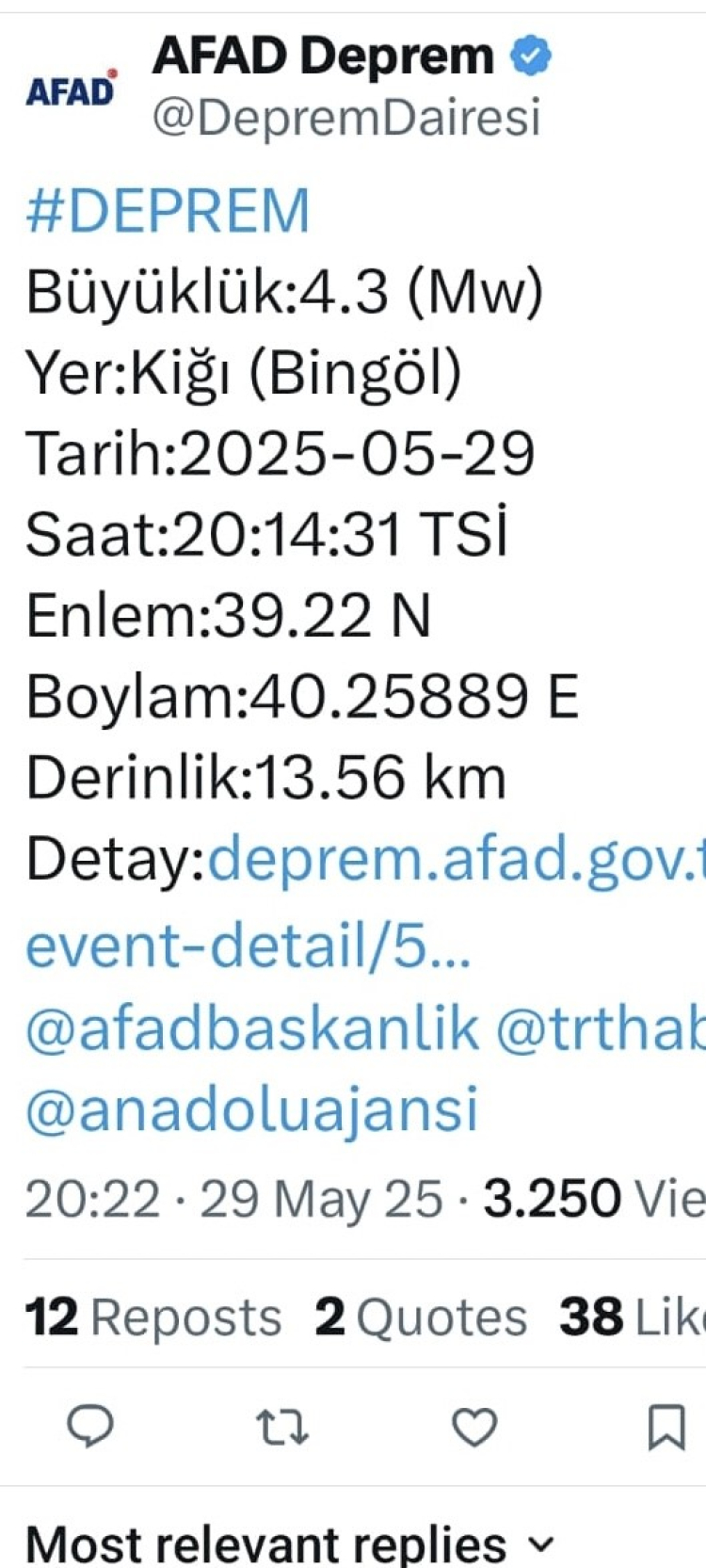 AFAD'dan yapılan açıklamaya göre, saat 20.14'te merkez üssü Bingöl'ün Kiğı ilçesinde 4,3 büyüklüğünde deprem meydana geldi. Yerin 13.56 kilometre derinliğinde meydana gelen depremde şimdiye kadar olumsuz bir duruma rastlanmadığı kaydedildi.