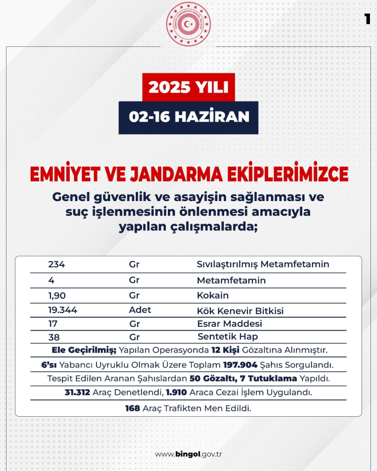 Bingöl Valiliği, son 2 hafta içerisinde emniyet ve jandarma ekiplerinin yaptığı çalışmaları paylaştı. Buna göre son 2 haftada 197 bin 904 şahsın sorgulandı, 31 bin 312 aracın denetledi ve bin 910 araca cezai işlem uygulandığı, 168 aracın ise trafikten men edildiği bildirildi. Aranan şahıslara yönelik düzenlenen operasyonlarda çeşitli suçlardan kesinleşmiş hapis cezası sebebiyle arama kaydı bulunan 18, ifadeye yönelik arama kaydı bulunan 85 olmak üzere toplam 103 şahsın yakalandığı aktarıldı.