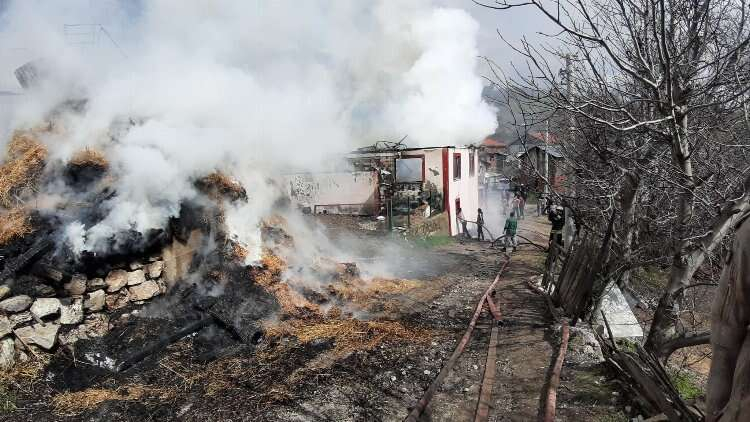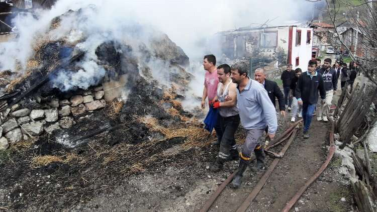 Bolu'nun Mudurnu ilçesinde çıkan yangında 3 ev 1 samanlık küle döndü. Yangını söndürmek isteyen 2 kişi yaralandı.