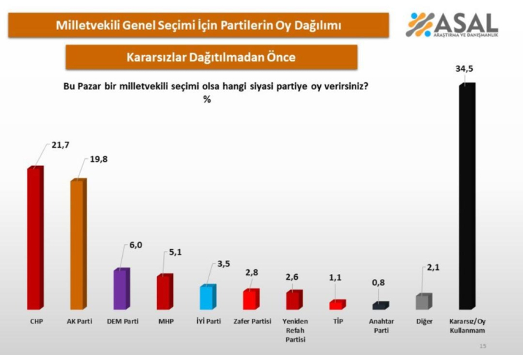 KARARSIZLARIN OY ORANI DAĞITILDIKTAN SONRA CHP YÜZDE 2,9 FARK İLE BİRİNCİ PARTİ