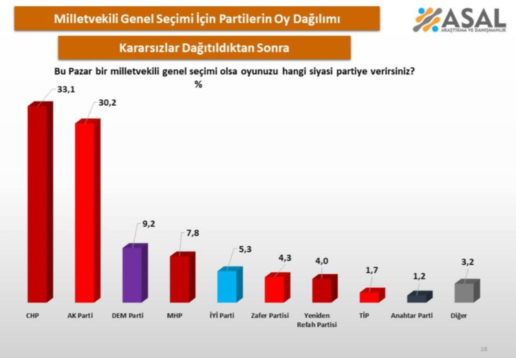Kararsızlar dağıtıldıktan sonra ise CHP yüzde 33,1 oy oranına, AK Parti ise yüzde 30,2 oy oranına çıktı. Aradaki fark ise 2,9 olarak ölçüldü.