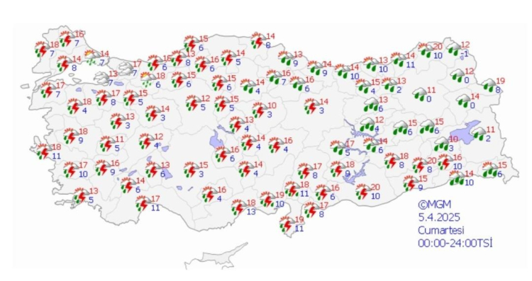 Yağışların genellikle yağmur ve sağanak, güney, iç ve batı kesimlerde yer yer gök gürültü sağanak, Doğu Karadeniz’in iç kesimleri ile Doğu Anadolu’nun kuzeydoğusunun yüksek kesimlerinde karla karışık yağmur ve kar şeklinde görülmesi beklenen yağışların Doğu Anadolu'nun batısı ile Antalya’nın doğusu, Mersin, Adana, Kahramanmaraş, Osmaniye, Hatay kıyıları, Aksaray, Bitlis, Şırnak, Hakkari, Adıyaman ve Siirt çevrelerinde yer yer kuvvetli olması bekleniyor.