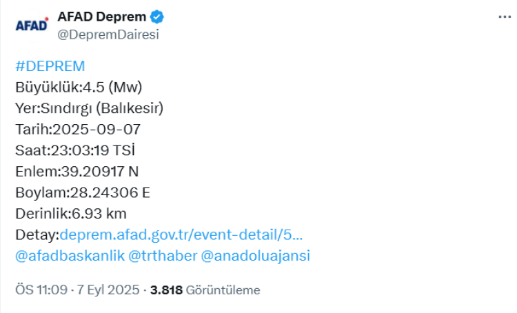 Balıkesir'in Sındırgı ilçesinde 4.5 büyüklüğünde bir deprem daha meydana geldi. Deprem Bursa'da da hissedildi.