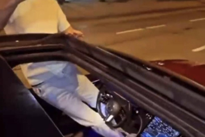 İstanbul Kadıköy'de otomobil ile seyir halinde olan sürücü, camdan sarkarak ayağıyla direksiyonu kontrol etmeye çalıştı.