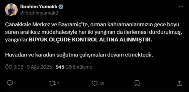 Tarım ve Orman Bakanı İbrahim Yumaklı Çanakkale'de çıkan yangınla ilgili olarak açıklamada bulundu. Bakan Yumaklı, "Çanakkale Merkez ve Bayramiç’te, orman kahramanlarımızın gece boyu süren aralıksız müdahalesiyle her iki yangının da ilerlemesi durdurulmuş, yangınlar büyük ölçüde kontrol altına alınmıştır. Havadan ve karadan soğutma çalışmaları devam etmektedir" dedi.