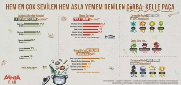Araştırmaya göre; katılımcılar kelle paça çorbasından sonra ikinci sırada yüzde 18,8 ile mercimek çorbasını, üçüncü sırada yüzde 10,9 ile işkembe çorbasını, dördüncü sırada yüzde 9,4 ile tarhana çorbasını ve beşinci sırada yüzde 7,8 ile yayla çorbasını seviyor.