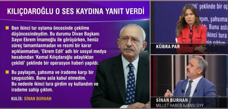 Ses kaydının kamuoyuna yansıması sonrası Kılıçdaroğlu cephesinden yeni açıklamalar geldi. Gazeteci Sinan Burhan, TV100’de katıldığı canlı yayında, Kılıçdaroğlu ile yaptığı görüşmeye dayanarak, ses kaydının yayınlanmasını “bir operasyonun devamı” olarak değerlendirdiğini aktardı.