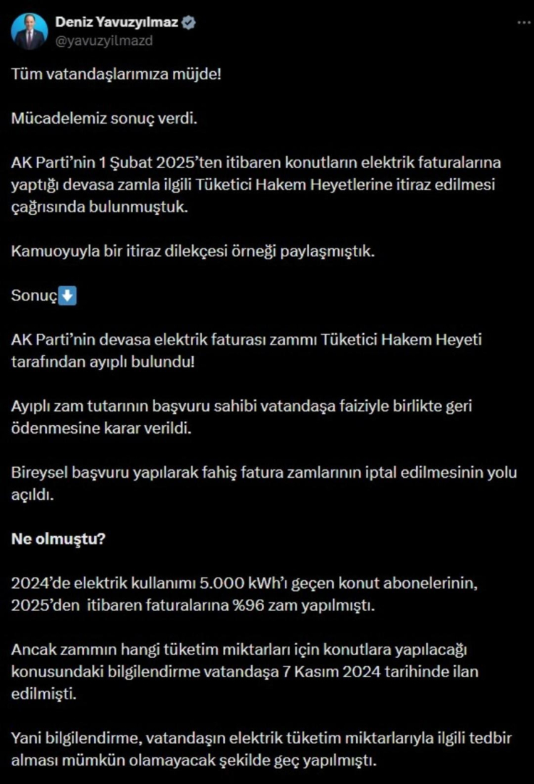 CHP'li Deniz Yavuzyılmaz, elektrik faturasına dair paylaşımında "AK Parti’nin 1 Şubat 2025’ten itibaren konutların elektrik faturalarına yaptığı devasa zamla ilgili Tüketici Hakem Heyetlerine itiraz edilmesi çağrısında bulunmuştuk. Sonuç; AK Parti’nin devasa elektrik faturası zammı Tüketici Hakem Heyeti tarafından ayıplı bulundu! Ayıplı zam tutarının başvuru sahibi vatandaşa faiziyle birlikte geri ödenmesine karar verildi. Bireysel başvuru yapılarak fahiş fatura zamlarının iptal edilmesinin yolu