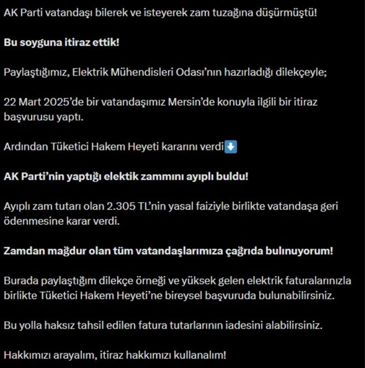 Bu soyguna itiraz ettik! Paylaştığımız, Elektrik Mühendisleri Odası’nın hazırladığı dilekçeyle; 22 Mart 2025’de bir vatandaşımız Mersin’de konuyla ilgili bir itiraz başvurusu yaptı. Ardından Tüketici Hakem Heyeti kararını verdi. AK Parti’nin yaptığı elektik zammını ayıplı buldu! Ayıplı zam tutarı olan 2.305 TL’nin yasal faiziyle birlikte vatandaşa geri ödenmesine karar verdi.