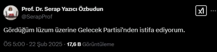 Geçtiğimiz seçimlerde CHP'den Antalya milletvekili seçilen Gelecek Partili Serap Yazıcı, partisinden istifa etti. Sosyal medya hesabından açıklamada bulunan Yazıcı "Gördüğüm lüzum üzerine Gelecek Partisi'nden istifa ediyorum." ifadelerini kullandı.