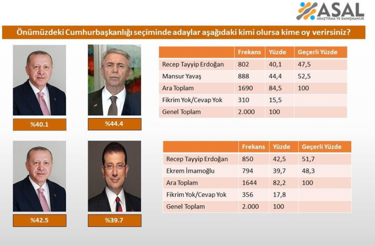 İki bin kişinin katıldığı araştırmada Cumhurbaşkanı Recep Tayyip Erdoğan'a, Yavaş ve İmamoğlu ayrı ayrı rakip edildi.