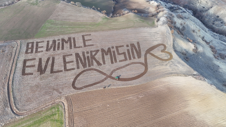 Çorum’un İskilip ilçesinde bir çiftçi, traktörle tarlaya "Benimle evlenir misin?" yazarak kız arkadaşına evlilik teklifi etti.
