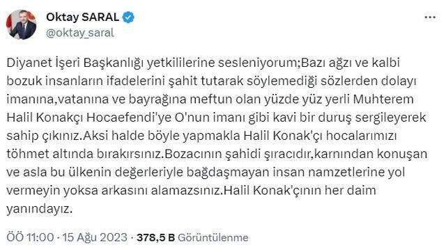 Açıklamaları ile gündemden düşmeyen imam Halil Konakçı hakkında Diyanet İşleri Başkanlığı’nın inceleme başlatması ile ilgili Cumhurbaşkanı Başdanışmanı Oktay Saral’dan açıklama geldi. Diyanet İşleri Başkanlığı’nın inceleme kararına tepki gösteren Saral paylaştığı mesajda, “Halil Konakçı’nın her daim yanındayız” ifadelerini kullandı.