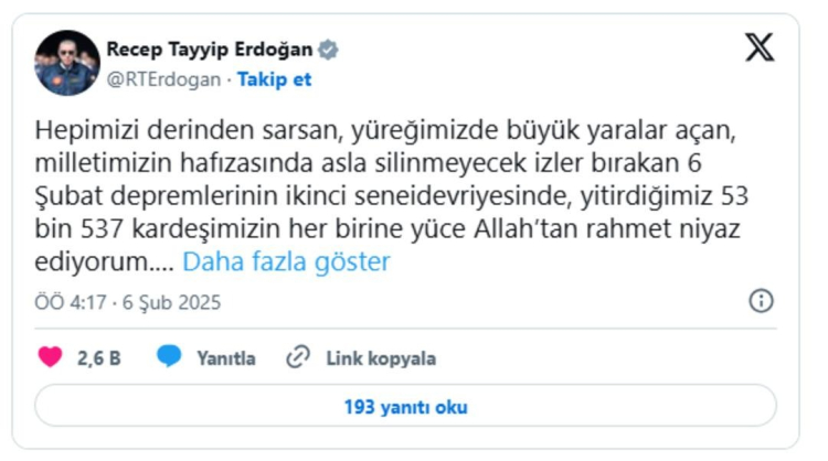 Cumhurbaşkanı Erdoğan, Kahramanmaraş merkezli 6 Şubat 2023'te meydana gelen depremlerin 2. yılında sosyal medya hesabından paylaşımda bulundu.