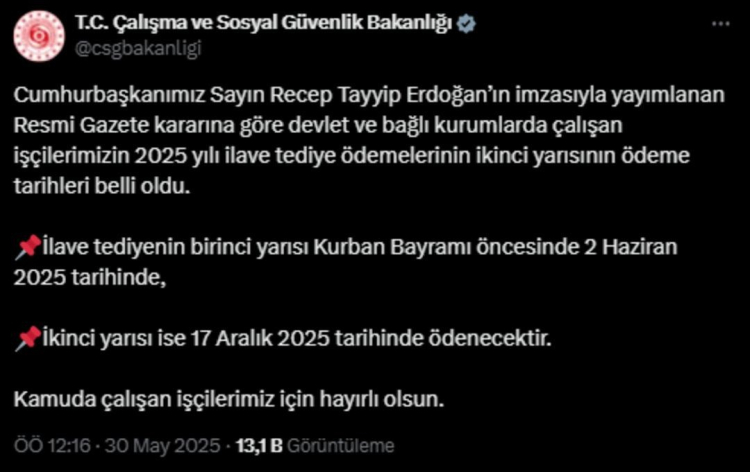 "Cumhurbaşkanımız Sayın Recep Tayyip Erdoğan’ın imzasıyla yayımlanan Resmi Gazete kararına göre devlet ve bağlı kurumlarda çalışan işçilerimizin 2025 yılı ilave tediye ödemelerinin ikinci yarısının ödeme tarihleri belli oldu. İlave tediyenin birinci yarısı Kurban Bayramı öncesinde 2 Haziran 2025 tarihinde, İkinci yarısı ise 17 Aralık 2025 tarihinde ödenecektir. Kamuda çalışan işçilerimiz için hayırlı olsun."