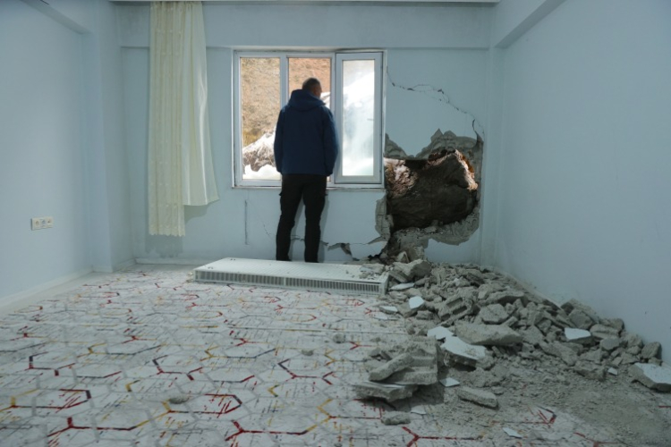 Hakkari'de yamaçtan kopan kaya parçası, bir binadaki dairenin duvarına zarar verdi.