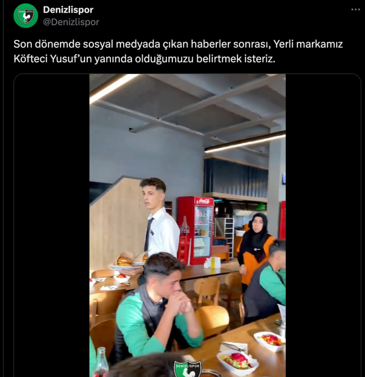 Denizlispor'un destek paylaşımı "Son dönemde sosyal medyada çıkan haberler sonrası, Yerli markamız Köfteci Yusuf’un yanında olduğumuzu belirtmek isteriz." şeklinde oldu.