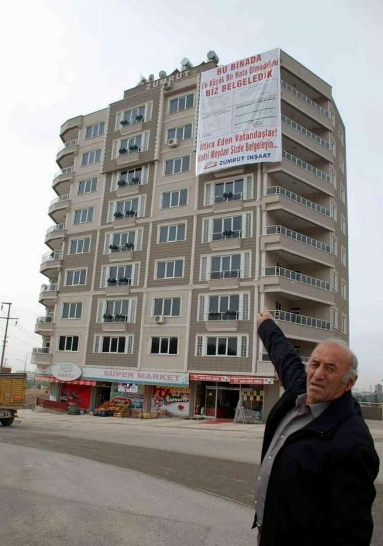 2010 yılı Aralık ayında, binaya astığı afişte “Bu binada en küçük bir hata olmadığını biz belgeledik. İftira eden vatandaşlar, hodri meydan siz de belgeleyin” başlığı altında Adıyaman Belediyesi’nden alınan Yapı Kullanma İzin Belgesi, Makine Mühendisinin Periyodik Ölçüm Raporu, Jeoloji Mühendisi’nin Zemin Etüdü Raporu ve İnşaat Mühendisleri Yapıda İmara aykırı olmadığı yönündeki raporların yer aldığı görüldü.