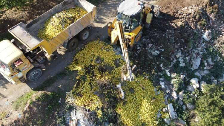 Yaklaşık 10 ton limon ilçe tarım müdürlüğü ekiplerinin gözetiminde imha edilmek üzere kamyona yüklenirken, o anlar havadan görüntülendi.