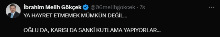 Gökçek tepkilerin hedefi olan paylaşımı hemen silip başka bir paylaşım daha yaptı. Gökçek diğer paylaşımda, "Ya hayret etmemek mümkün değil... Oğlu da karısı da sanki kutlama yapıyorlar" dedi.
