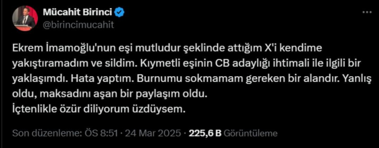 Birinci gelen tepkilerin ardından paylaşımını sildi ve özür diledi. Birinci, "Ekrem İmamoğlu'nun eşi mutludur şeklinde attığım X'i kendime yakıştıramadım ve sildim. Kıymetli eşinin CB adaylığı ihtimali ile ilgili bir yaklaşımdı. Hata yaptım. Burnumu sokmamam gereken bir alandır. Yanlış oldu, maksadını aşan bir paylaşım oldu. İçtenlikle özür diliyorum üzdüysem" dedi.
