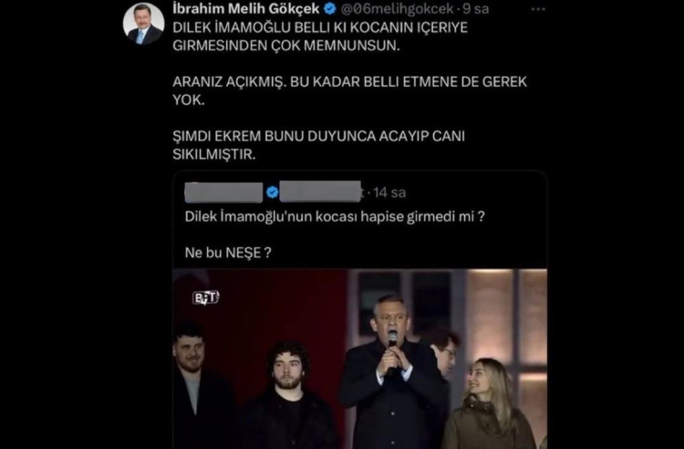 İBB Başkanı Ekrem İmamoğlu'nun gözaltına alınmasının ardından başlayan protestolar, İmamoğlu tutuklandıktan sonra da devam etti. CHP lideri Özgür Özel, İmamoğlu'nun eşi Dilek İmamoğlu ve partililer her gün Saraçhane'ye gelirken, ABB eski Başkanı Melih Gökçek, Dilek İmamoğlu'nu güldüğü fotoğraf üzerinden hedef aldı. Gökçek, gelen tepkilerin ardından paylaşımını apar topar sildi ve sonra yeni bir paylaşım daha yaptı. Ayrıca Dilek İmamoğlu'nu hedef alan AK Partili Mücahit Birinci de özür diledi.