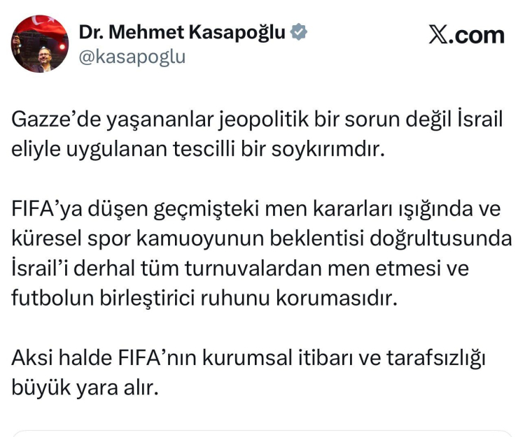 Dr. Kasapoğlu, sosyal medya hesabından yaptığı açıklamada, "Gazze’de yaşananlar jeopolitik bir sorun değil İsrail eliyle uygulanan tescilli bir soykırımdır. FIFA’ya düşen geçmişteki men kararları ışığında ve küresel spor kamuoyunun beklentisi doğrultusunda İsrail’i derhal tüm turnuvalardan men etmesi ve futbolun birleştirici ruhunu korumasıdır. Aksi halde FIFA’nın kurumsal itibarı ve tarafsızlığı büyük yara alır" ifadelerine yer verdi.