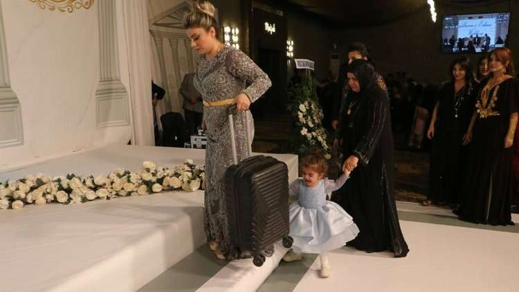 Gecede, geline takılmak için korumalar eşliğinde sahneye getirilen bir valiz dolusu 8 kilogram ağırlığında bilezik, taç, kemer, gerdanlık, kolye gibi takılar takıldı