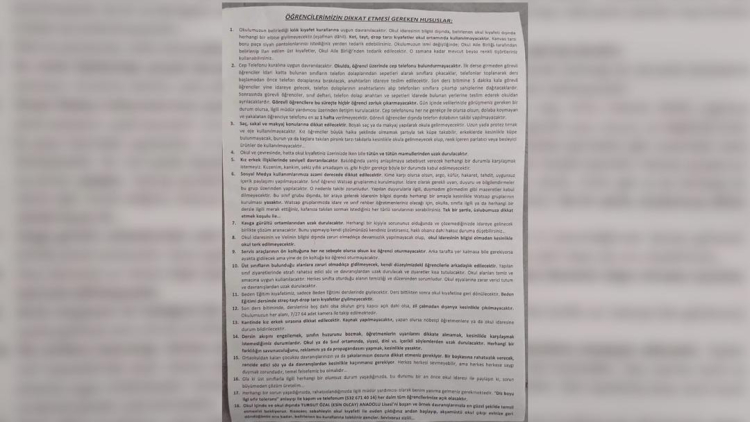 18 maddelik listede "Servis araçlarının ön koltuğuna her ne sebeple olursa olsun kız öğrenci oturmayacaktır. Arka tarafta yer kalmasa bile gerekiyorsa ayakta gidilecek ama yine de ön koltuğa kız öğrenci oturmayacaktır." gibi maddeler yar aldı. Söz konusu belgeyi gazeteci Nevşin Mengü paylaştı.