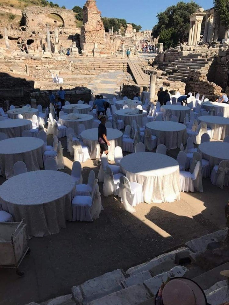 Dün akşam ise Efes Antik Kenti'ni ziyaret eden insanlar, Celsus Kütüphanesi'ne geldiklerinde bir barikat ile karşılaştı. Masaların kurulduğu antik kütüphanede Amerikan Wind Star Cruise Gemisi'nin ziyaretçilerine yemek organizasyonu düzenlediği anlaşıldı.