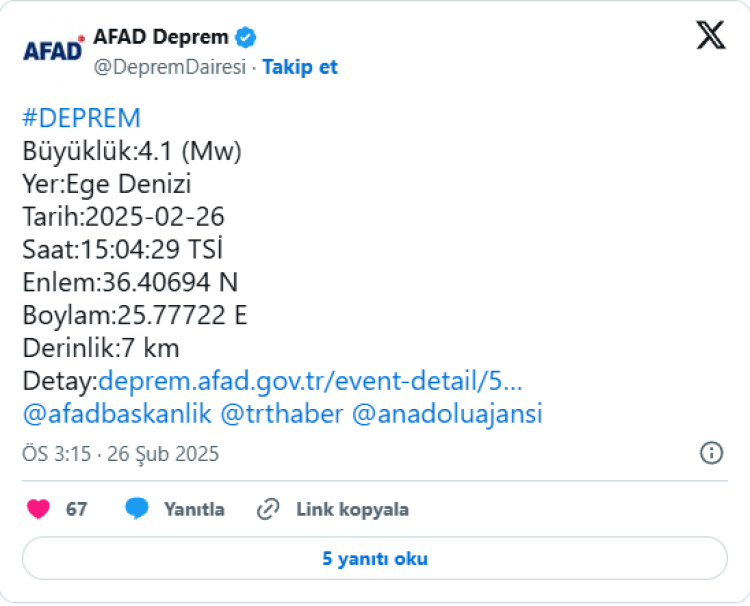 Buna göre, saat 15.04'te Ege Denizi merkezli 4.1 büyüklüğünde bir deprem meydana geldi.