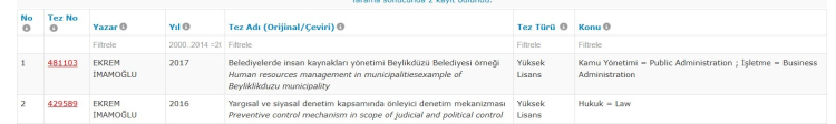 İmamoğlu'nun 2016 tarihli “Yargısal ve siyasal denetim kapsamında önleyici denetim mekanizması” ve 2017 tarihli “Belediyelerde insan kaynakları yönetimi Beylikdüzü Belediyesi örneği” başlıklı tezleri henüz YÖK'ün Ulusal Tez Merkezi'nde görülüyor.