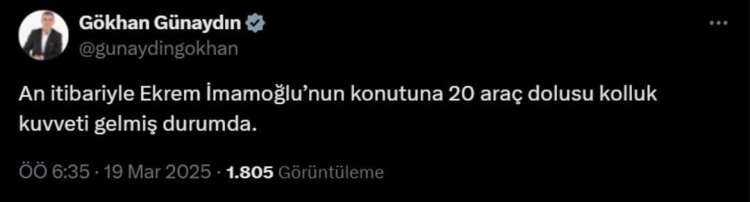 Günaydın sosyal medya hesabından konuyla ilgili olarak yaptığı paylaşımda şu ifadelere yer verdi: "An itibariyle Ekrem İmamoğlu’nun konutuna 20 araç dolusu kolluk kuvveti gelmiş durumda"