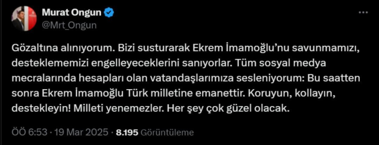Öte yandan İmamoğlu'nun danışmanı Murat Ongun da sosyal medya hesabından gözlatına alındığını duyurdu. Ongun, "Gözaltına alınıyorum. Bizi susturarak Ekrem İmamoğlu’nu savunmamızı, desteklememizi engelleyeceklerini sanıyorlar. Tüm sosyal medya mecralarında hesapları olan vatandaşlarımıza sesleniyorum: Bu saatten sonra Ekrem İmamoğlu Türk milletine emanettir. Koruyun, kollayın, destekleyin! Milleti yenemezler. Her şey çok güzel olacak" ifadelerini kullandı.