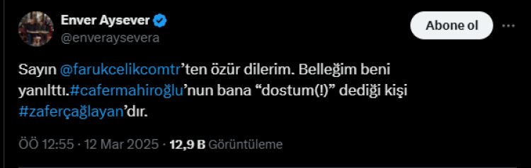 Daha sonra sosyal medya hesabı üzerinden açıklama yapan Aysever, "Sayın Faruk Çelik'ten özür dilerim. Belleğim beni yanılttı. Cafer Mahiroğlu’nun bana “dostum(!)” dediği kişi Zafer Çağlayan’dır." ifadelerini kullandı.