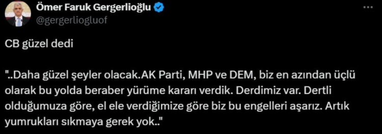 Türkiye siyasetini derinden etkileyecek sözlere DEM Parti'den de destek geldi. DEM Parti Kocaeli Milletvekili Ömer Faruk Gergerlioğlu, "Cumhurbaşkanı güzel dedi" şeklinde paylaşım yaptı. Gergerlioğlu paylaşımında, "CB güzel dedi. '..Daha güzel şeyler olacak. AK Parti, MHP ve DEM, biz en azından üçlü olarak bu yolda beraber yürüme kararı verdik. Derdimiz var. Dertli olduğumuza göre, el ele verdiğimize göre biz bu engelleri aşarız. Artık yumrukları sıkmaya gerek yok.." ifadelerini kullandı.