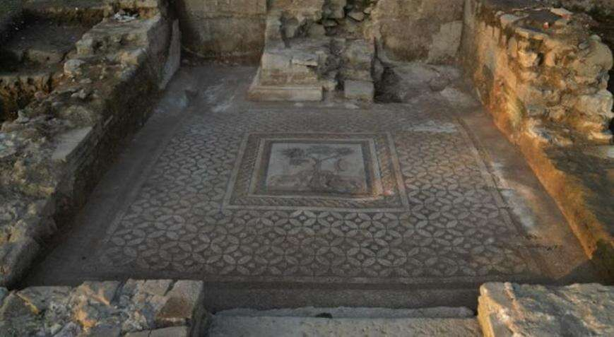 Konuralp Müze Müdürlüğü'nden yapılan yazılı açıklamada, tiyatro aksının tam ortasına denk gelecek şekilde mozaikli bir yapının ortaya çıkarıldığı ifade edilerek, "Bu oda yapısının iç duvarları kalın bir harç tabakası üzerine mermer plakalar ile kaplı olduğu ve odanın kuzey güney yönünde dikdörtgen planlı olduğu belirlenmiştir. Odanın kuzeyinde, iç tarafa doğru bi platform temeli gözlenmektedir. Tüm odanın ince işçilik ile yapılmış beyaz, mavi, sarı, yeşil ve kahverengi tesseralardan oluşan bir mozaik taban ile kaplı olduğu görülmüştür. Geometrik desenler ile bezeli mozaiğin kenarları daha büyük ve renkli tesseralardan oluşan bir çerçeve şeklinde yapılmıştır. Mozaiğin ortasında ise daha küçük tesseralar ile yapılan dörtgen çerçevenin iç tarafında bir sahne betimlenmiştir. Eserler bize buranın Dionysos Kült Mekanı olduğunu göstermiştir." denildi.
