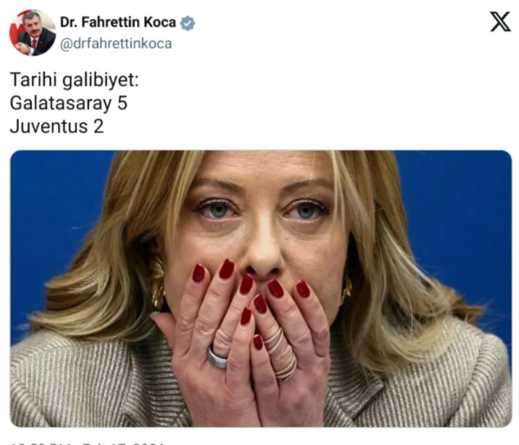 Galatasaray, UEFA Şampiyonlar Ligi son 16 play-off turu ilk maçında Juventus'u 5-2'lik ezici bir skorla mağlup ettiği maçın ardından Eski Sağlık Bakanı Fahrettin Koca, Cimbom'un bu başarısını İtalya Başbakanı Giorgia Meloni’nin fotoğrafı ile kutlamıştı.