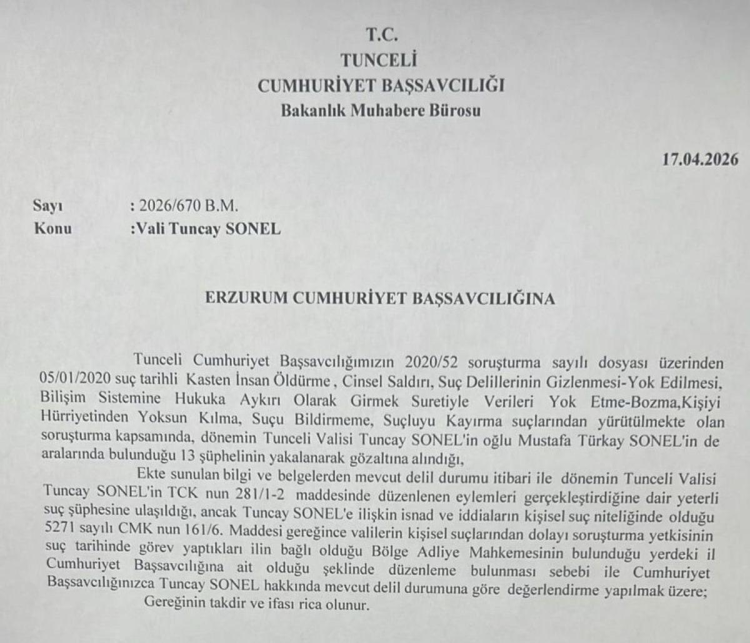 Tunceli eski Valisi Tuncay Sonel hakkındaki iddialarla ilgili olarak soruşturma başlatıldı.