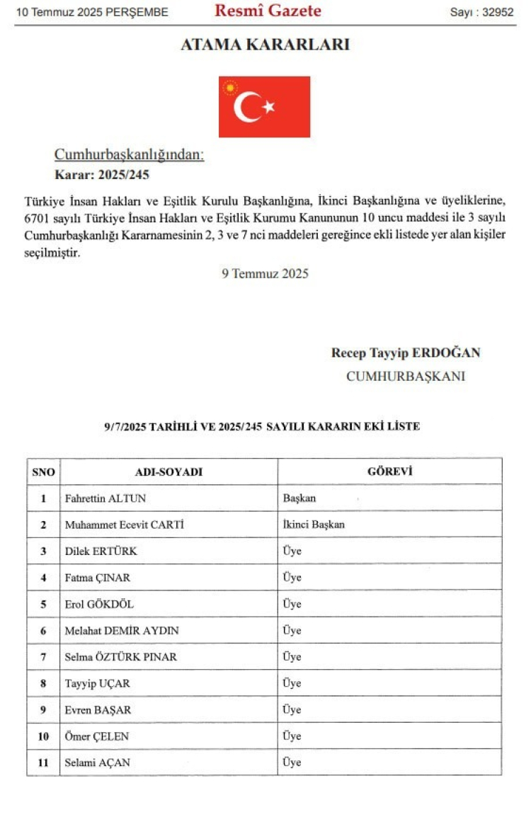 Karara göre, Muhammet Ecevit Carti ikinci başkan olarak atanırken Türkiye İnsan Hakları ve Eşitlik Kurulu üyeliklerine Dilek Ertürk, Fatma Çınar, Erol Gökdöl, Melahat Demir Aydın, Selma Öztürk Pınar, Tayyip Uçar, Evren Başar, Ömer Çelen ve Selami Açan getirildi.