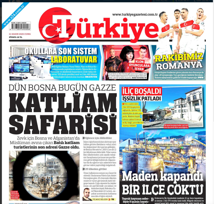 "İnsan biraz utanır yahu! Şu malum 'Safari' haberini herkes gibi Türkiye Gazetesi de önemseyip manşete çekmiş. Ama... O Türkiye Gazetesi'nin 1993 senesinde bir muhabirinin "gazeteci olduğunu unutup" Sırp ordusu saflarından birilerine ateş ettiğini ballandıra ballandıra nasıl manşet yaptığını unutmadık. Hiç mi utanmaz bu adamlar?