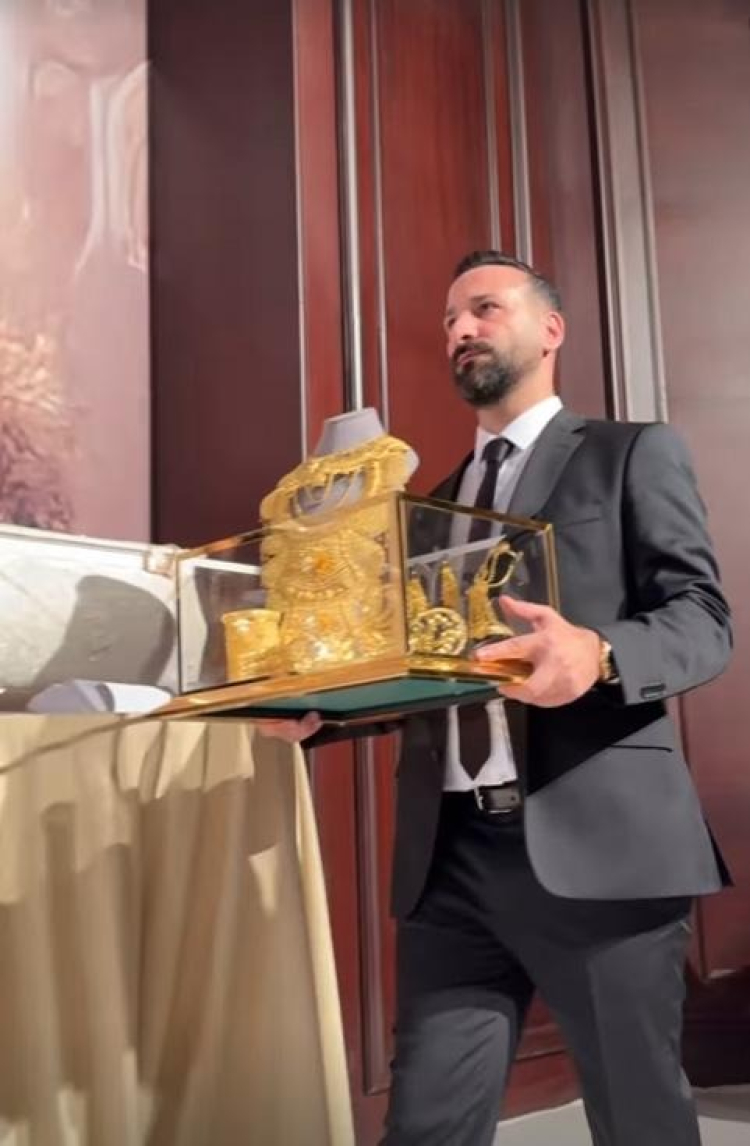 Aleyna Dalveren'e düğünde takılan altınlar dikkat çekti. Cam bir fanusun içinde milyon dolarlık altın setlerle damadın gelmesi herkesi şaşkına çevirdi.