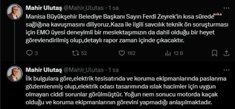 “Manisa Büyükşehir Belediye Başkanı Sayın Ferdi Zeyrek'in kısa sürede sağlığına kavuşmasını diliyoruz. Kaza ile ilgili savcılık teknik ön soruşturması için EMO üyesi deneyimli bir meslektaşımızın da dahil olduğu bir heyet görevlendirilmiş olup, detaylı rapor zaman içinde çıkacaktır.