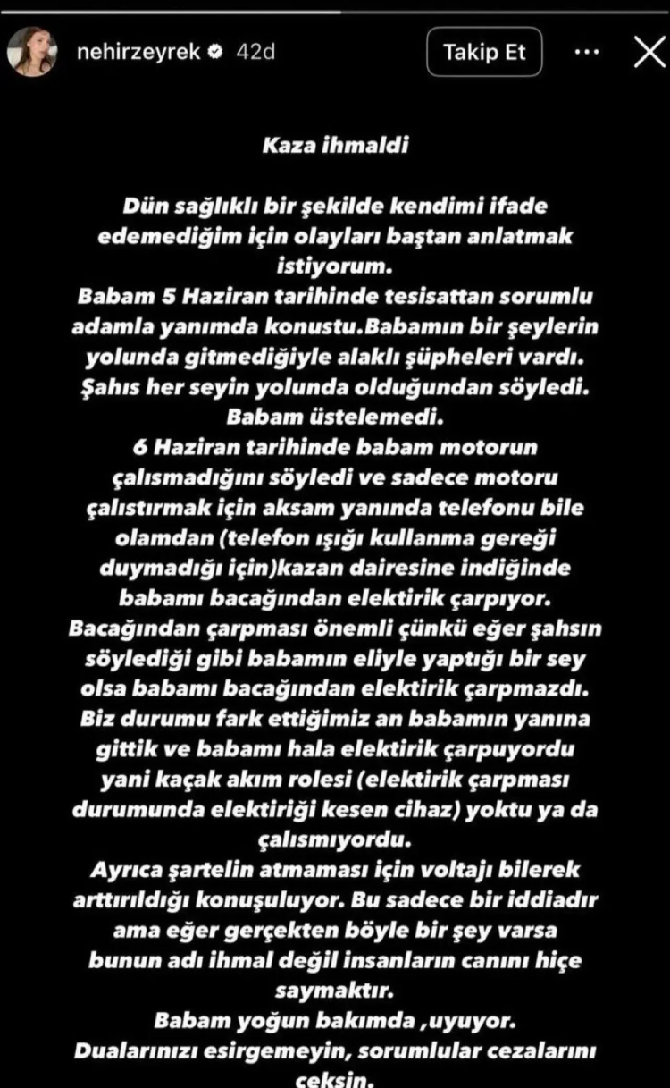Tedavi sürecinde kızı Nehir Zeyrek olayla ilgili açıklamada bulunmuştu.