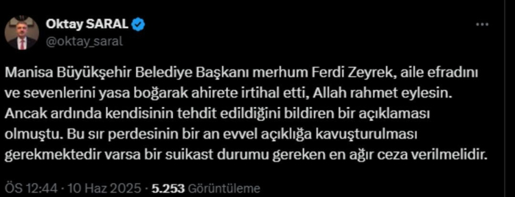 "Manisa Büyükşehir Belediye Başkanı merhum Ferdi Zeyrek, aile efradını ve sevenlerini yasa boğarak ahirete irtihal etti, Allah rahmet eylesin. Ancak ardında kendisinin tehdit edildiğini bildiren bir açıklaması olmuştu. Bu sır perdesinin bir an evvel açıklığa kavuşturulması gerekmektedir varsa bir suikast durumu gereken en ağır ceza verilmelidir."