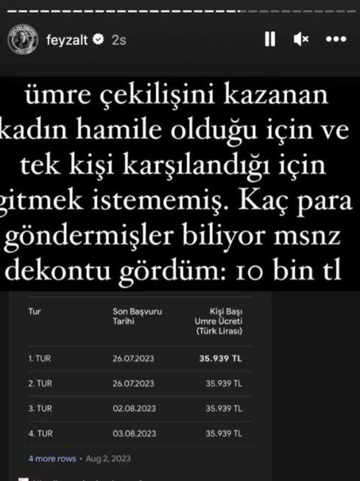 Öz çiftinin yaptığı umre çekilişini kazanan kadının ise hamile olduğunu söyleyen Feyza Altun, kadının yalnızca bir kişinin ücreti karşılandığı için gitmediğini duyurdu.