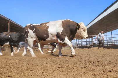 Oğuzeli ilçesi Karataş Mahallesi'ndeki büyükbaş hayvan çiftliğinde çalışan veteriner teknikeri Mehmet Can Bartık'ın yetiştirdiği 3,5 yaşındaki "Fıstık", alıcısını bekliyor.