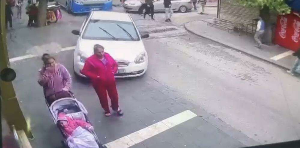 Görüntülerde, ara sokaktan caddeye dönen beyaz otomobilin, hızlı bir şekilde kaldırıma çıkarak kaldırımda yürüyen 2 kadın ile içerisinde bebek bulunan bebek arabasına çarpma ile olay sonrası kadın sürücünün panikle araçtan inme anları anbean yer aldı.