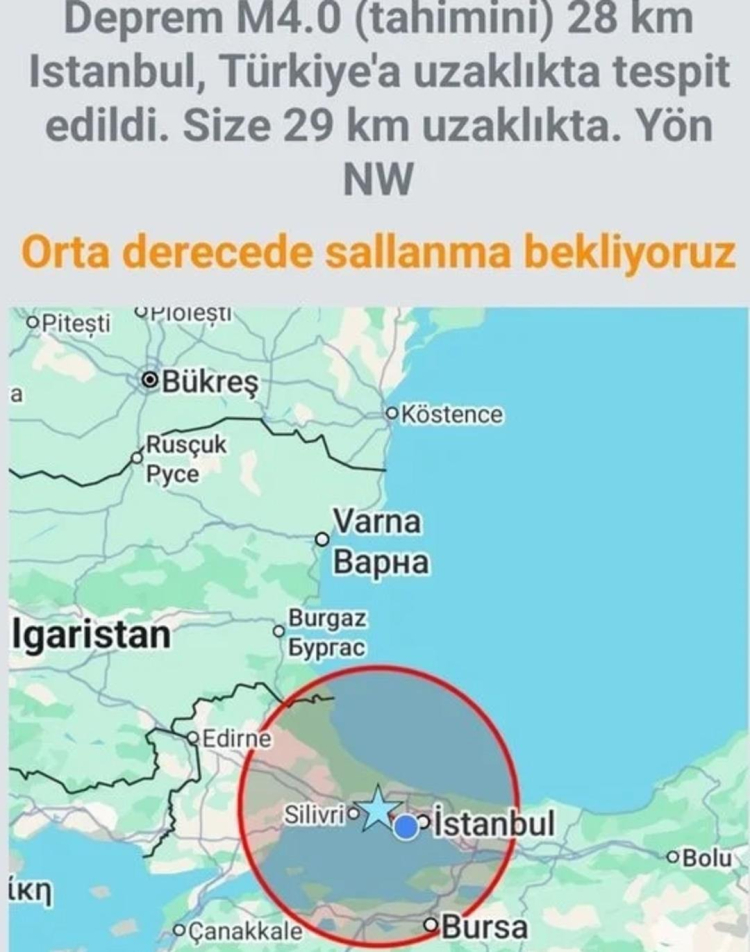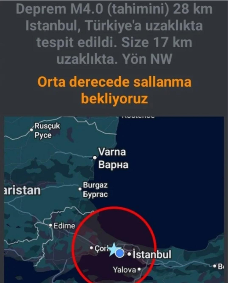 İstanbulluların cep telefonlarına gelen deprem bildirimi endişe yarattı. Gece saatlerinde söz konusu bildirimi gören çok sayıda kişi kısa süreli panik yaşadı. Herhangi bir sarsıntı hissetmediğini belirten İstanbul'da yaşayan bazı kullanıcılar sosyal medyada "Depremi hisseden var mı?" diye sordu.